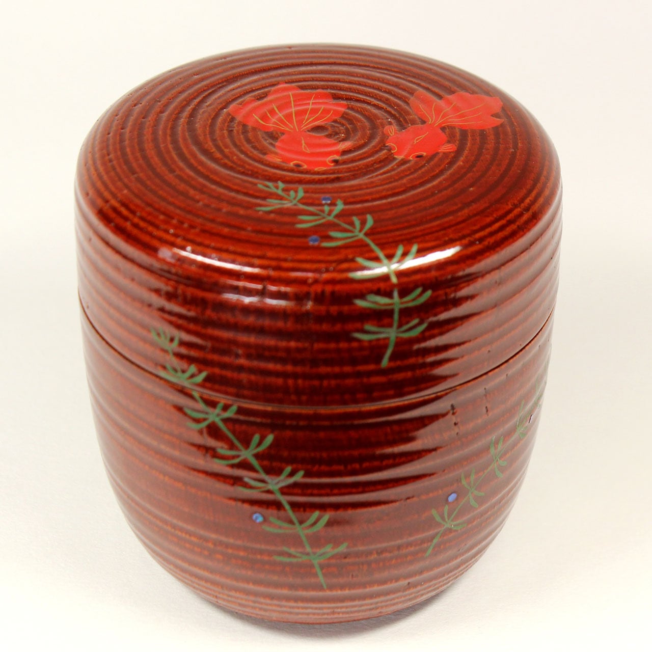 和田寿峰作溜乱筋金魚蒔絵中棗は、溜乱筋の木地に可愛らしい金魚を蒔絵して、夏の涼しさを表現しています。遊び心溢れる一品です。