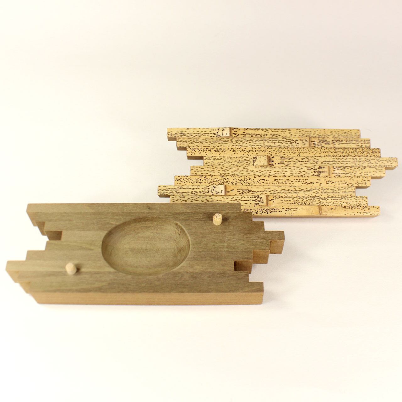 ゴマ竹で作られた香合は、上品な風合いと手触りが特徴です。香合の形状は、実際に竹の筏をイメージしてデザインされました。(全長13cm)