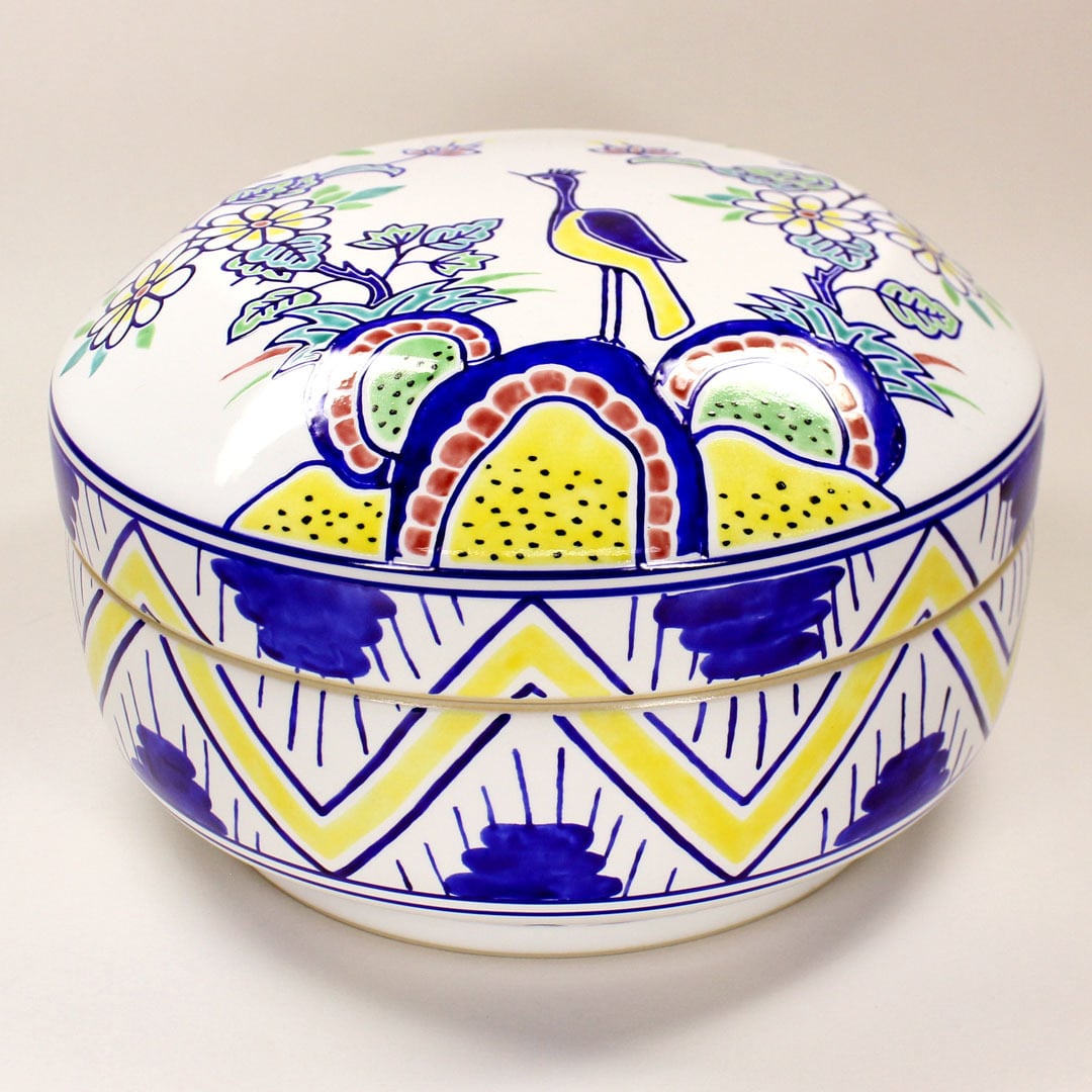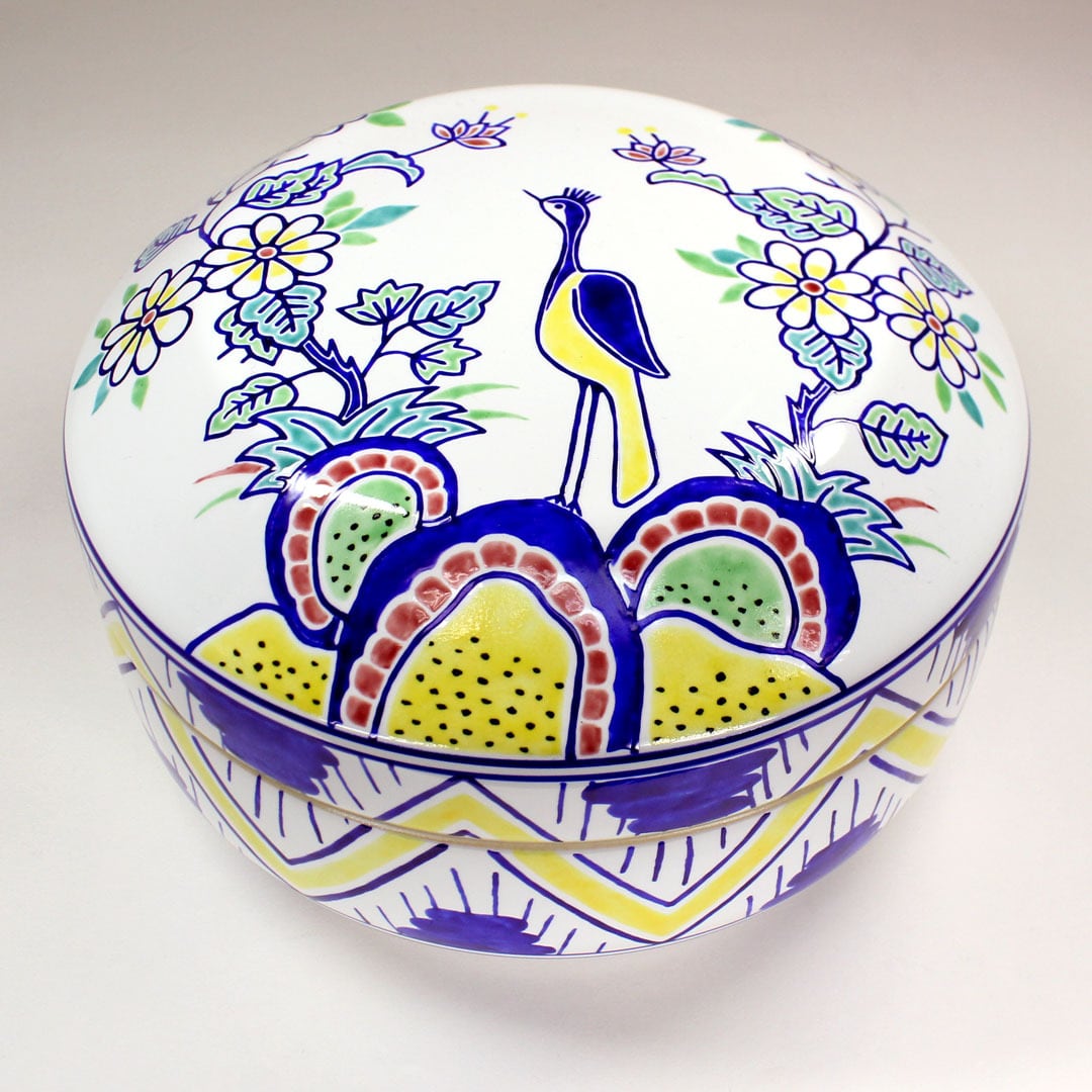 先代 眞葛香斎 作のオランダ写し花鳥喰籠です。久田宗匠による箱書も付いています。この喰籠は、オランダ風の花鳥模様を写したもので、絵付けには精緻な技術と繊細な筆使いが施されています。高度な技術が光る作品で、風雅な芸術品として愛玩して頂けます。